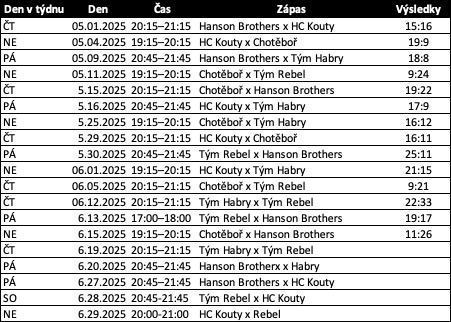 7) Součástí zápasu není rozhodčí. Na faulu / platnosti gólu apod se musí shodnout oba týmy. V případě zájmu je možné se domluvit na odpískání zápasu s ledařem (pískání ze střídačky)